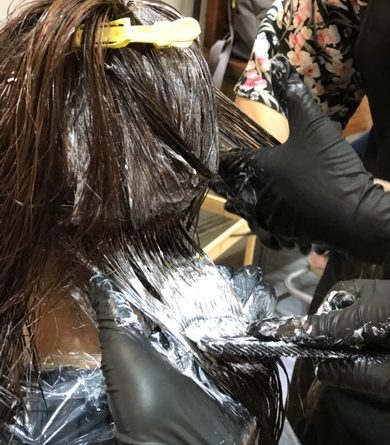 首先會先噴上頭皮防護,可以在頭皮上形成一層保護屏障,降低去色和染色過程頭皮有可能產生的不適感.
