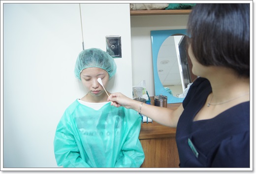 這是要進手術室時的前置準備,手術衣、手術帽樣樣俱全,很講究呢!護士正在幫我消毒,護士小姐跟我說不要小看眼睛手術,衛生環境是非常重要的!雖然穿上手術衣的時候我又開始緊張了,但是護士細心一步一步的幫我消毒,我心裡也有種踏實感,很感謝眼科的護士!