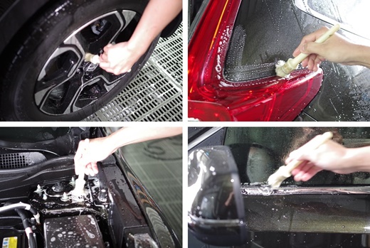 鍍膜開始前會先做清洗,不是大面積的清洗,是全車仔細且針對細部也會很講究的刷洗,只要是做全車身加玻璃鍍膜,幾乎外觀看得到的地方(包含鈑件縫隙),都會上到鍍膜藥劑.